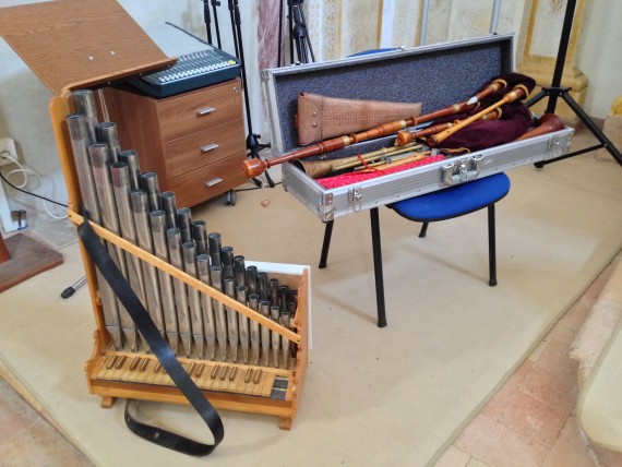 Gli strumenti utilizzati, presentati con una spiegazione accurata, sono fedeli ricostruzioni di quelli del periodo: organo portativo, campane, viola, ribeca, trombe dritte, tamburello, cimbali, zufolo col tamburo, flauto dritto, flauto traverso, doppio flauto, piffero, cornamusa, liuto, guinterna.